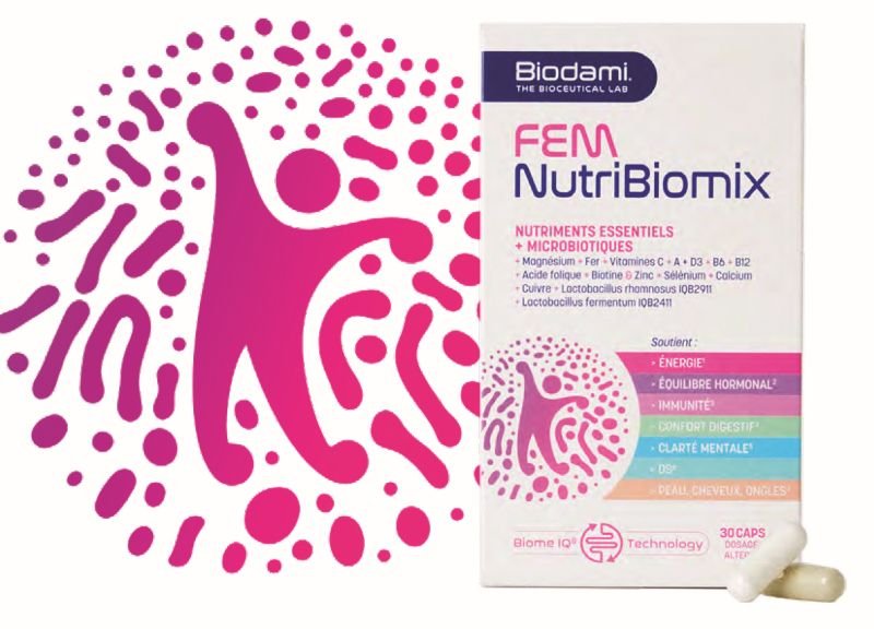 Pour soutenir cet équilibre essentiel, la start-up belge Biodami – fondée par deux biologistes mettant la science du microbiote au cœur de leurs produits – lance FEM NutriBiomix, la première supplémentation all-in-one activée par le microbiote, pour répondre aux besoins des femmes. FEM NutriBiomix est la première formule hybride qui allie nutrition essentielle et science du microbiote pour un impact démultiplié. Elle contient deux souches probiotiques ciblées (lactobacillus rhamnosus IQB2911 et lactobacillus fermentum IQB2411), sélectionnées pour leur rôle dans le maintien d'une flore intestinale équilibrée, en soutenant le microbiote et en libérant tout le potentiel des vitamines et des minéraux ; ce qui aide le corps à tirer pleinement parti de chaque nutriment. La formule contient également treize vitamines et minéraux essentiels (fer, magnésium, vitamines C, A, B6, B12, D3, acide folique, biotine, calcium, sélénium, zinc et cuivre) dont le corps féminin a besoin.