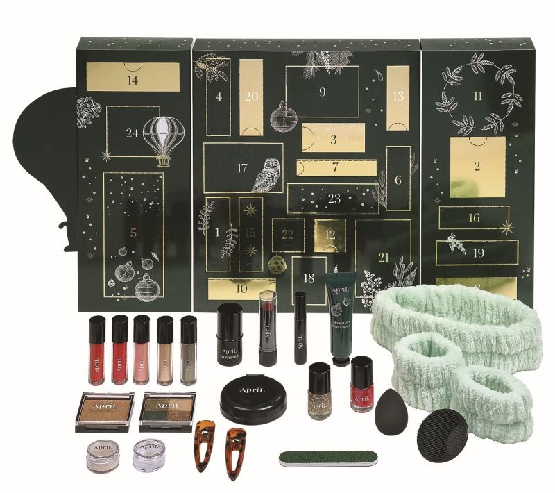 Véritable écrin de trésors de beauté pour attendre Noël, le Calendrier de l’Avent April renferme – dans ses 24 cases surprises – une sélection inédite d’essentiels beauté tendance et d’accessoires : duo de barrettes écaille, blush crème, masque et huile pour les lèvres, bandeau de maquillage, bracelets de nettoyage doux. Auxquels s’ajoutent les indispensables produits de maquillage : enlumineur, gloss, mascara, palette de fards à paupières et bien d’autres surprises à découvrir. Le tout est présenté dans un coffret féerique, de couleur verte et décoré d’une montgolfière, entourée d’étoiles, de feuillages de la forêt enchantée. Disponible dans les boutiques April et Di, ainsi que via les sites April-beauty.com et www.di.be.