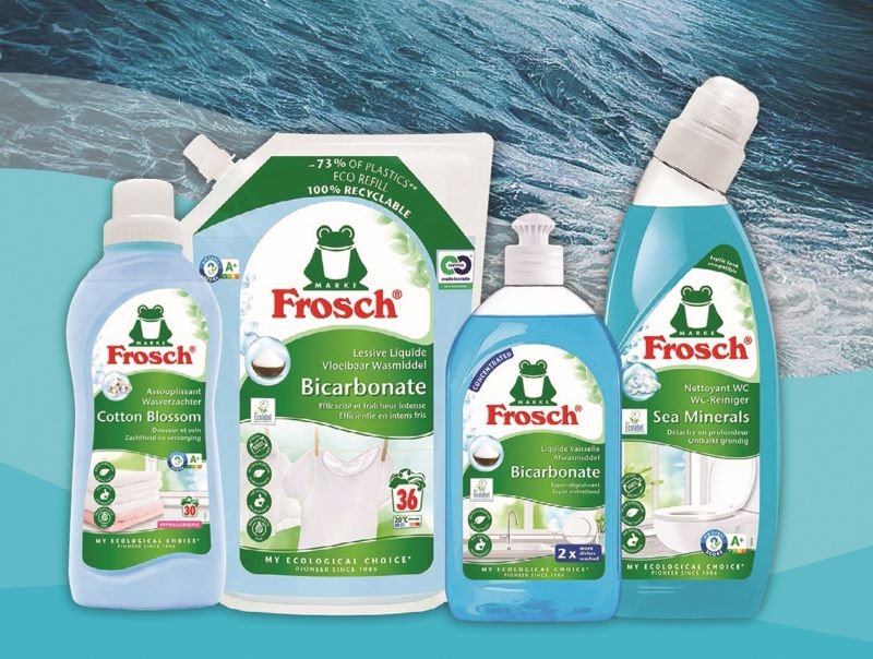 Frosch est une marque du groupe allemand Werner & Mertz. Si à l’origine l’entreprise – fondée en 1867 par les frères Werner, qui s’associeront par la suite avec Georg Mertz – était axée sur la fabrication de cires et cirages, dès 1945, elle opte pour un développement dans le secteur de l’hygiène du linge et du nettoyage. En 1986, le groupe s’engage dans la protection de la planète et la sensibilisation à la cause environnementale et crée Frosch : la marque, pionnière en matière de produits de nettoyage et d’hygiène destinés au grand public, alliant la force d’actifs naturels très efficaces avec le respect de l’environnement et de la peau. Frosch révolutionne le marché européen et devient leader des produits d’entretien écologiques. Pour assurer une efficacité dégraissante et détachante, les produits nettoyants doivent contenir des tensioactifs. L’innovation de Frosch est de substituer les tensioactifs traditionnels, issus de la pétrochimie, par des tensioactifs provenant de sources végétales renouvelables. Aujourd’hui, presque tous les produits Frosch contiennent entre 10 et 100 % de tensioactifs provenant d’huiles végétales européennes. La marque intègre également dans ses formules des actifs d’origine naturelle tels que le vinaigre, le citron et le bicarbonate de soude. Et parce que les produits d’entretien entrent forcément en contact avec la peau, la marque enrichit ses produits d’ingrédients naturels qui protègent la peau comme l’aloe vera et la provitamine B5. Du linge de maison en passant par la vaisselle, le nettoyage du sol, de la cuisine ou la salle de bain, Frosch propose une vingtaine de produits nettoyants conditionnés en flacons 100% recyclables, vendus dans les supermarchés et chez Bio Planet. La dernière vague de nouveautés Frosch est la Blue Wave, composée de quatre produits d’entretien (photo) dont les formules sont certifiées écolabel, vegan, sans ingrédients d’origine animale et à base de tensioactifs européens d’origine végétale : un assouplissant à la fleur de coton pour le linge, un liquide vaisselle et une (recharge) lessive liquide au bicarbonate, ainsi qu’un nettoyant wc formulé à base de minéraux marins.