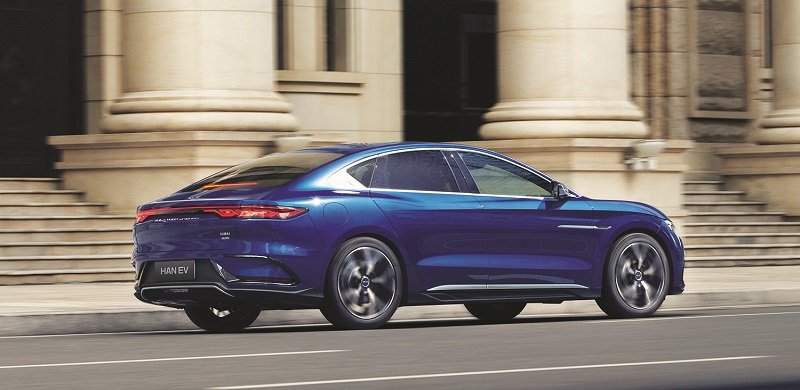 La BYD HAN est une berline du segment E, avec 487 ch et une autonomie de 521 km cycle WLTP mixte. Elle est équipée d'une traction intégrale avec double moteur et une suspension intelligente. Un système de pompe à chaleur à haut rendement est fourni en standard, de même que le dernier système de freinage assisté intégré (IPB) de Bosch. Une ligne audacieuse – un coefficient de trainée ultra-faible de 0,23 – et innovante est complétée par un intérieur luxueux. Les phares à banderoles en cristal et la barre lumineuse arrière à LED pleine largeur ont une allure futuriste. L'habitacle est lumineux et spacieux. Le véhicule est équipé d'un écran tactile multimédia de 15,6 pouces, réglable à l'horizontale ou à la verticale, et d'un système audio Dynoaudio équipé de 12 haut-parleurs avec son «surround». Les sièges en cuir Nappa sont chauffants à l'avant et à l'arrière, ainsi que le volant. Un pavé multifonctions situé dans l''accoudoir du siège arrière permet le réglage du siège avant, du toit coulissant panoramique, du contrôle de température... Un regret, le volume réduit du coffre!