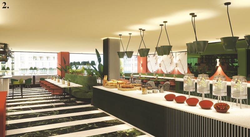 Photos : 1. chambre Art & Sky – bibliothèque / 2. Restaurant Gritto – buffet.