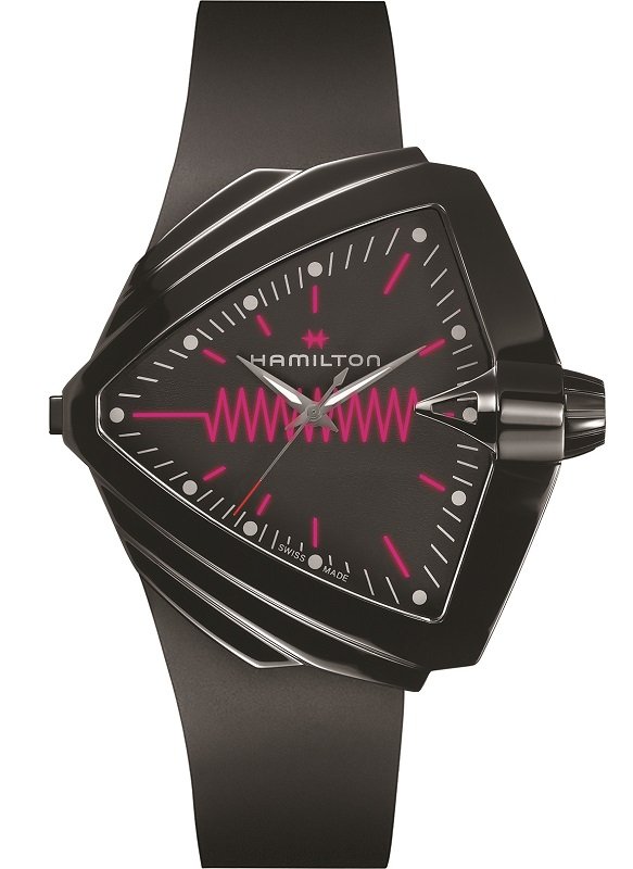 Cette montre «Ventura XXL Bright» est une version surdimensionnée au cadran rouge de la «Ventura» de Hamilton, au circuit électrique innovant et au boîtier de forme audacieuse. Elle est équipée d'un mouvement quartz avec impulsion électrique éclairante, d'un cadran noir, d'un verre saphir. Et est montée sur un bracelet en caoutchouc noir.