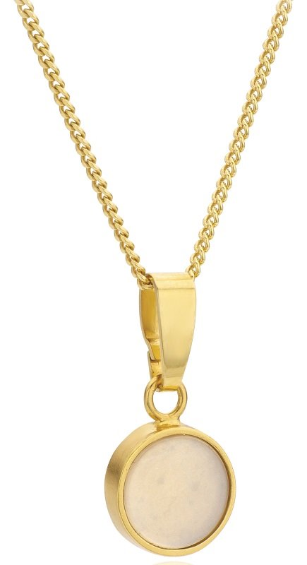 Pendentif en or jaune issu de la collection «Pride», réalisée par la créatrice belge Kim Jacob. Un bijou, au design pur et minimaliste, mettant à l'honneur la pierre de lune.