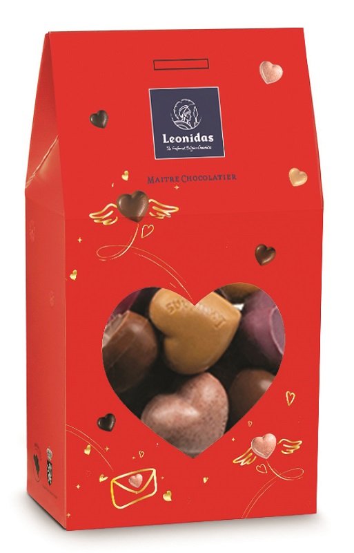 Pour fêter la Saint-Valentin, la gamme de cœurs en chocolat de Leonidas s'enrichit de trois nouveaux petits cœurs. L'un est au chocolat blanc fourré de praliné. Un deuxième au chocolat blanc, coloré naturellement par la spiruline bleue, fourré d’une crème à l’orange sanguine enrichie de baies de goji. Et le troisième, au chocolat blanc coloré naturellement et fourré d’une fine ganache à la cerise et à la baie de sureau.