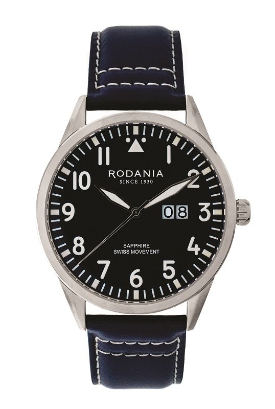 Montre «Locarno Pilot» de Rodania munie d'un mouvement suisse, d'un verre saphir, d'index et d'aiguilles en superluminova assurant une visibilité optimale, même la nuit. L’ouverture de 44mm, le cadran bleu nuit accompagné d’un bracelet bleu marine surpiqué blanc, en fait un magnifique modèle sportif chic.
