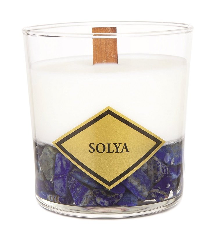 Pour sa première collection de bougies, Solya a sélectionné les pierres semi-précieuses (jaspe rouge, oeil de tigre, lapis lazuli, amazonite, améthyste et quartz rose) de ses collections de bijoux pour créer 16 bougies originales entièrement réalisées à la main, dans ses ateliers bruxellois. Chaque bougie est composée à 100% de cire de soja naturelle et biodégradable tandis que les mèches utilisées sont en bois. Une fois allumées, elles crépitent pour créer une atmosphère sonore de feu de cheminée caractéristique. Une fois la bougie consumée, les pierres semi-précieuses peuvent être nettoyées et ensuite, exposées sur une étagère ou placées dans le fond d'un vase.